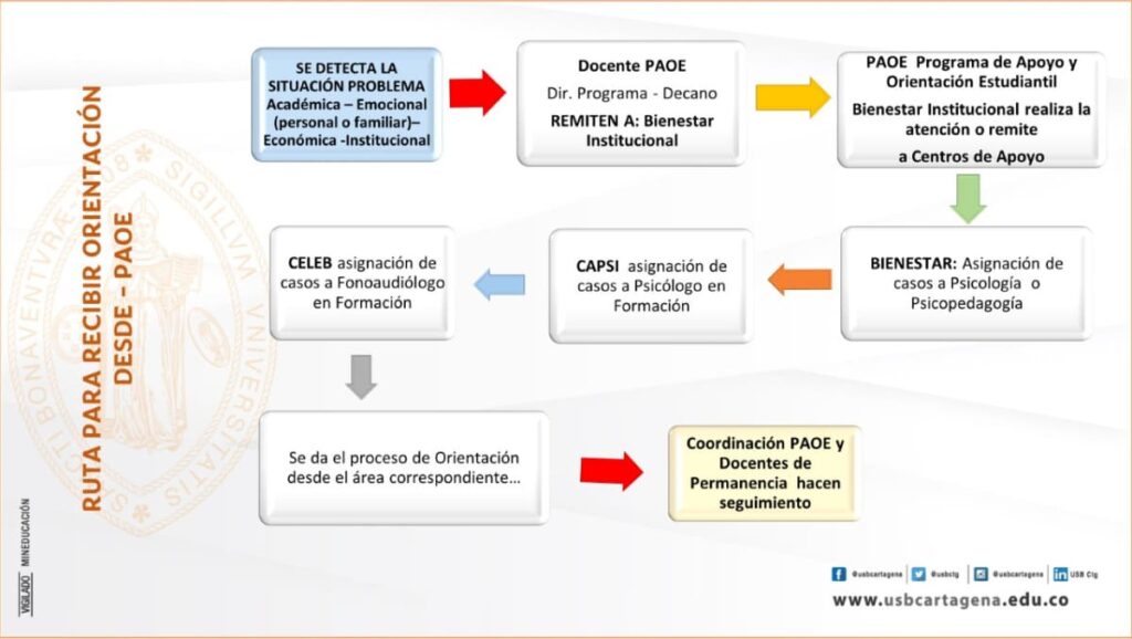 - Orientación Pedagógica: Es realizada por Psicólogos de Bienestar Institucional, pasantes del Programa de Psicología y Docentes de áreas específicas según sea el caso, estos últimos, previa coordinación con el encargado de Permanencia de la Facultad o el Director del Programa.